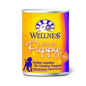 Water is an extremely important nutrient with respect to a dog's overall well-being. Formulated with the same whole food philosophy as our kibble -- complete and balanced nutrition using only the finest ingredients -- Wellness canned foods are an easy way to increase your dog's water intake. Wellness Just for Puppy Canned Recipe is nutritionally balanced with fruits, vegetables, vitamins, and minerals to support the development of strong muscles, bones, organs, and teeth. Real-food ingredients include "de-boned" chicken, salmon, barley, flaxseed, carrots, sweet potatoes, apples and pears.